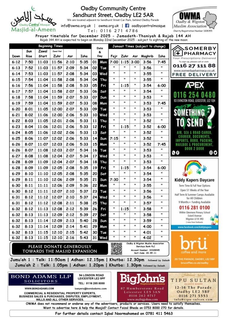 | Fajr | 6:07 am | 6:45 am |